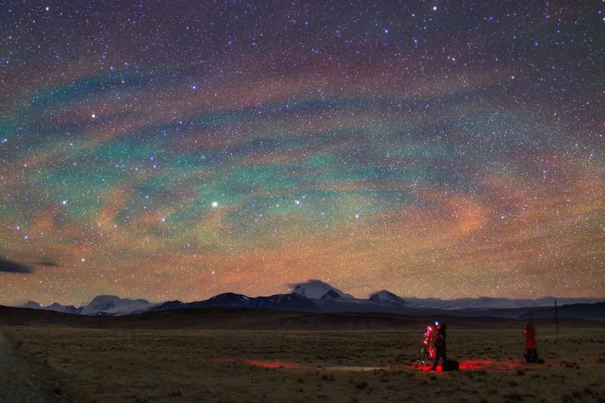 这个不寻常的夜晚里,异常明亮的旋涡状气辉渲染了喜马拉雅山脉的夜空,照片中两位观星者正在捕捉这极其罕见的天文奇观。气辉是一种高层大气暗淡的发光现象,由太阳电磁辐射激发高层大气中的某些成分,引起发射和散射而造成的。气辉与极光出现的高度相近,不过它在全球各地皆可见。照片中罕见的旋涡状结构,则是由数百公里外孟加拉上空强烈雷暴引起的大气重力波振动而形成。